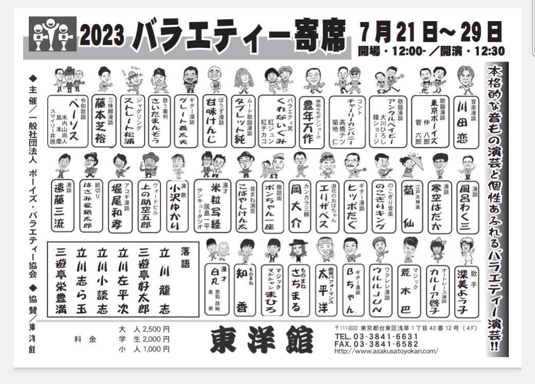 2023-06-27 kiku News 出演情報, 江戸太神楽, 江戸太神楽菊仙 0 likes29 views0 min 2023年6月30日 浅草東洋館スペシャル寄席に出演します。 出番は13:45〜です。 宜しくお願い申し上げます!! 0 Facebook Twitter News 2023年7月23日『楽しもう!演芸の世界〜演芸ワークショップ〜』 2023-06-07 Previous Article News 浅草東洋館 ボーイズ・バラエティー協会下席/浅草東洋館スペシャル寄席 2023-07-142023-10-31 Next Article You May Also Like 9月・10月 スケジュール 2025-09-01 【ご挨拶】[関係者各位様へ] 2025-08-21 残暑お見舞い申し上げます! 2025-08-20